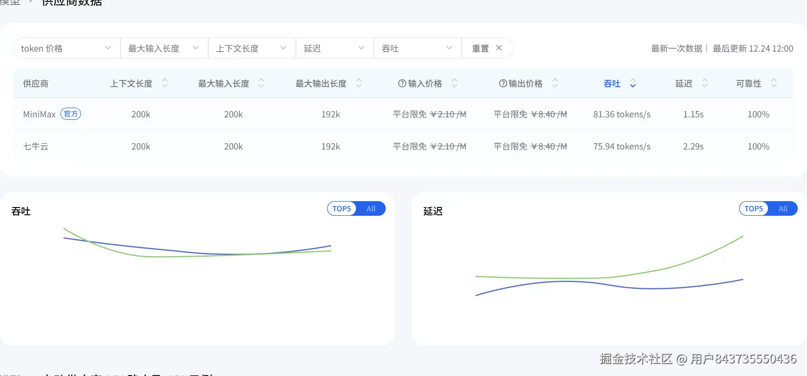 - 供应商选择:平台会展示各供应商的实时吞吐量、延迟、可靠性等数据(例如,GLM-4.7 可选择智谱官方、PPIO 派欧云等供应商,MiniMax M2.1 可选择官方或七牛云),建议优先选择延迟较低的供应商(如智谱官方 GLM-4.7 的 P90 延迟仅 0.61s,七牛云 MiniMax M2.1 延迟 0.54s)。