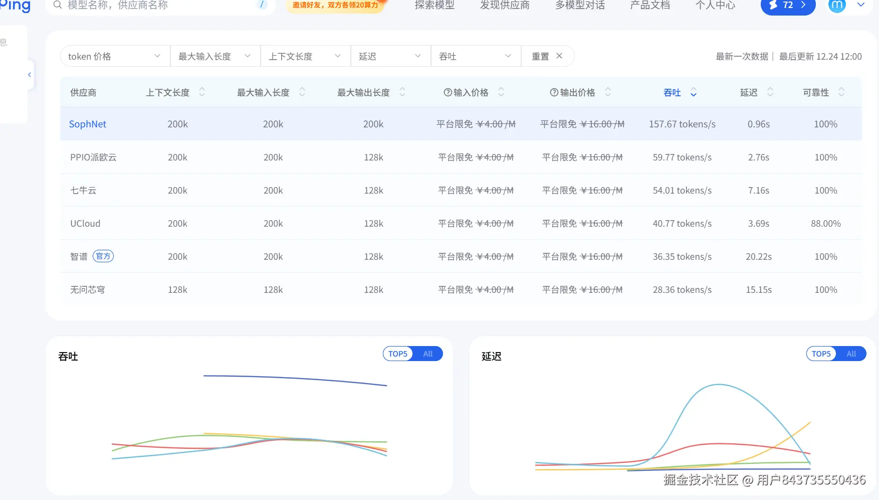 - 性能监控:在平台【数据看板】可查看各供应商的实时性能数据,高峰期可切换至吞吐量高、延迟低的供应商,保障调用稳定性;