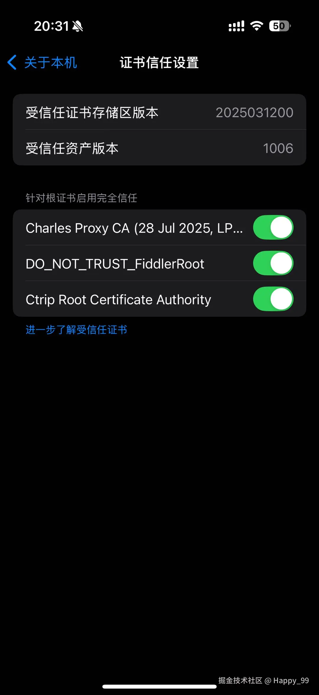 手机:设置 - 通用 - 关于本机 - 证书信任设置 - 对证书启用信任