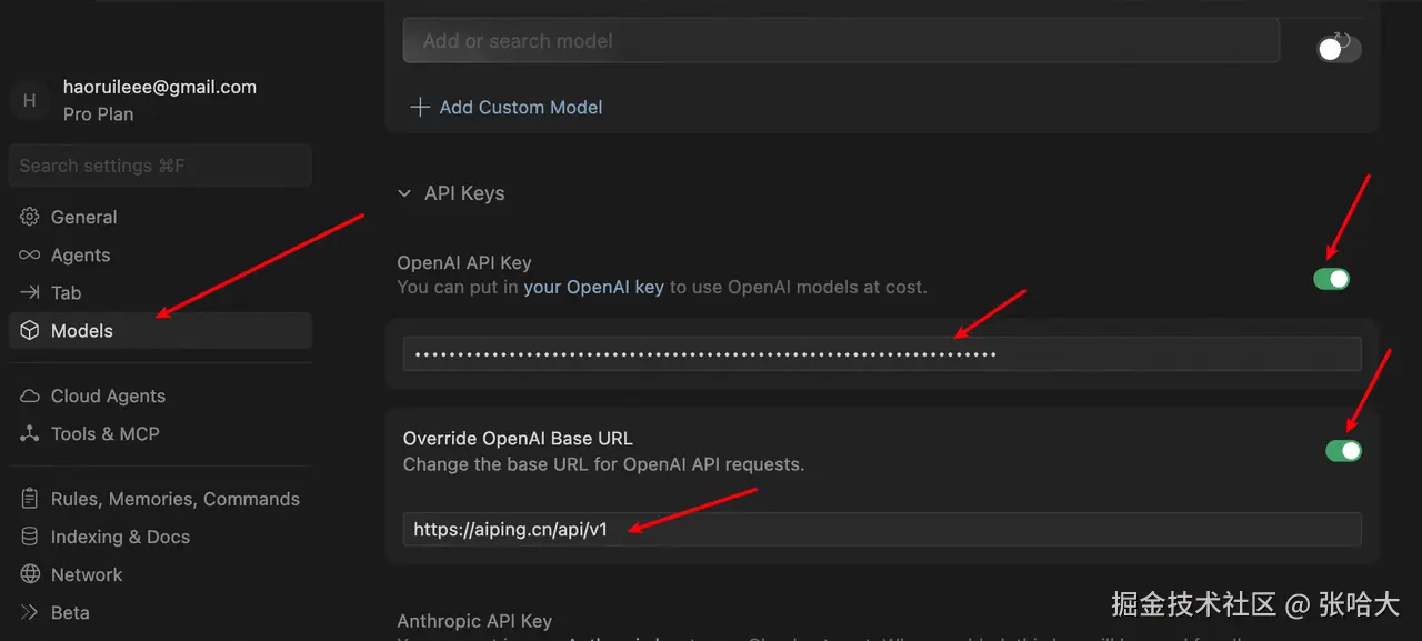 配置AI Ping API:左侧栏点“Models”进入模型配置页,展开“API Keys”部分——勾选“Override OpenAI Base URL”,输入AI Ping调用地址:aiping.cn/api/v1,再把AI Ping的API Key填到OpenAI API Key输入框里;