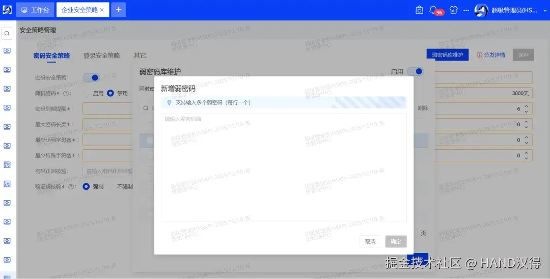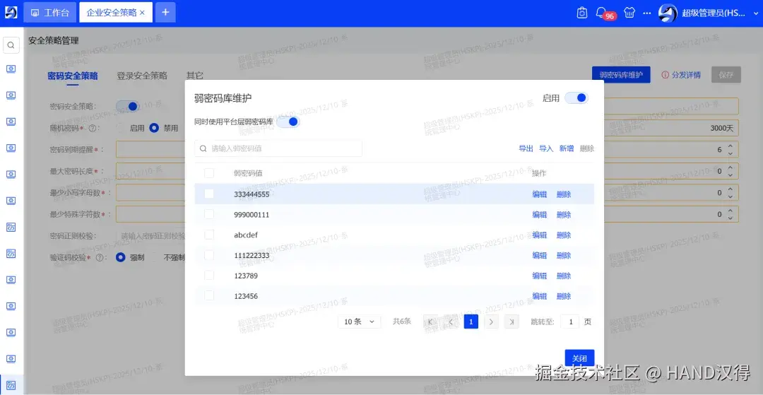 企业级自定义弱密码库 各企业可灵活启用平台弱密码库,并根据企业自身安全策略、行业特性或内部规范,维护专属的弱密码列表,实现安全规范的自主化管理。