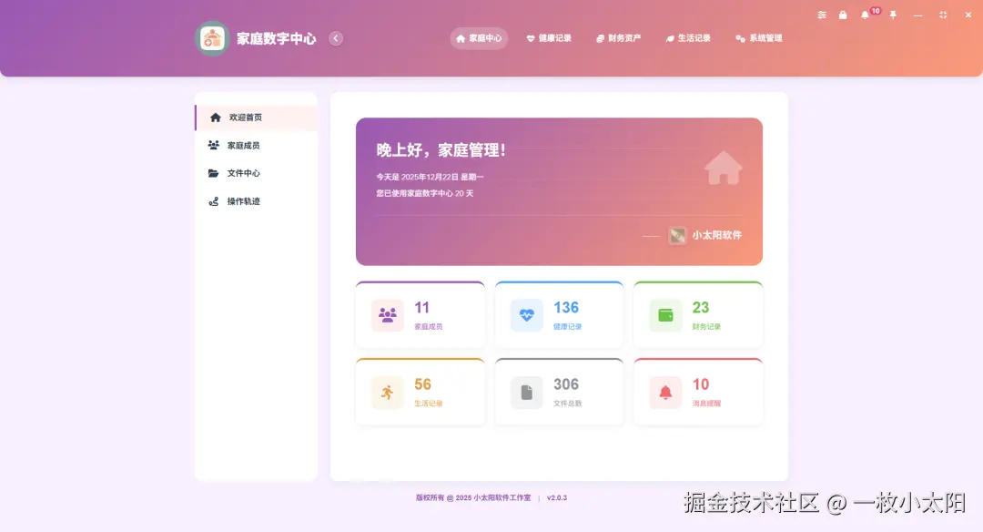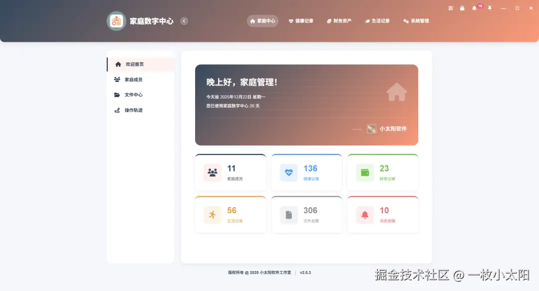家庭数字中心-设计篇(十二)皮肤切换 一枚小太阳 2025-12-24 36 阅读1分钟 有8套皮肤切换可供选择,各种主题风格任意选择,美观、简洁、大方,不满意随便换。目前在登录界面、系统设置-皮肤切换这2个地方实现皮肤切换。 切换效果如下,以家庭首页为例 1.复古红韵版 2.海洋青蓝版 3.简约灰调版 4.日落橙光版 5.温馨家庭版 6.现代蓝调版 7.优雅紫韵版 8.自然绿意版 以上8款主题皮肤,有没有你喜欢的,欢迎留言