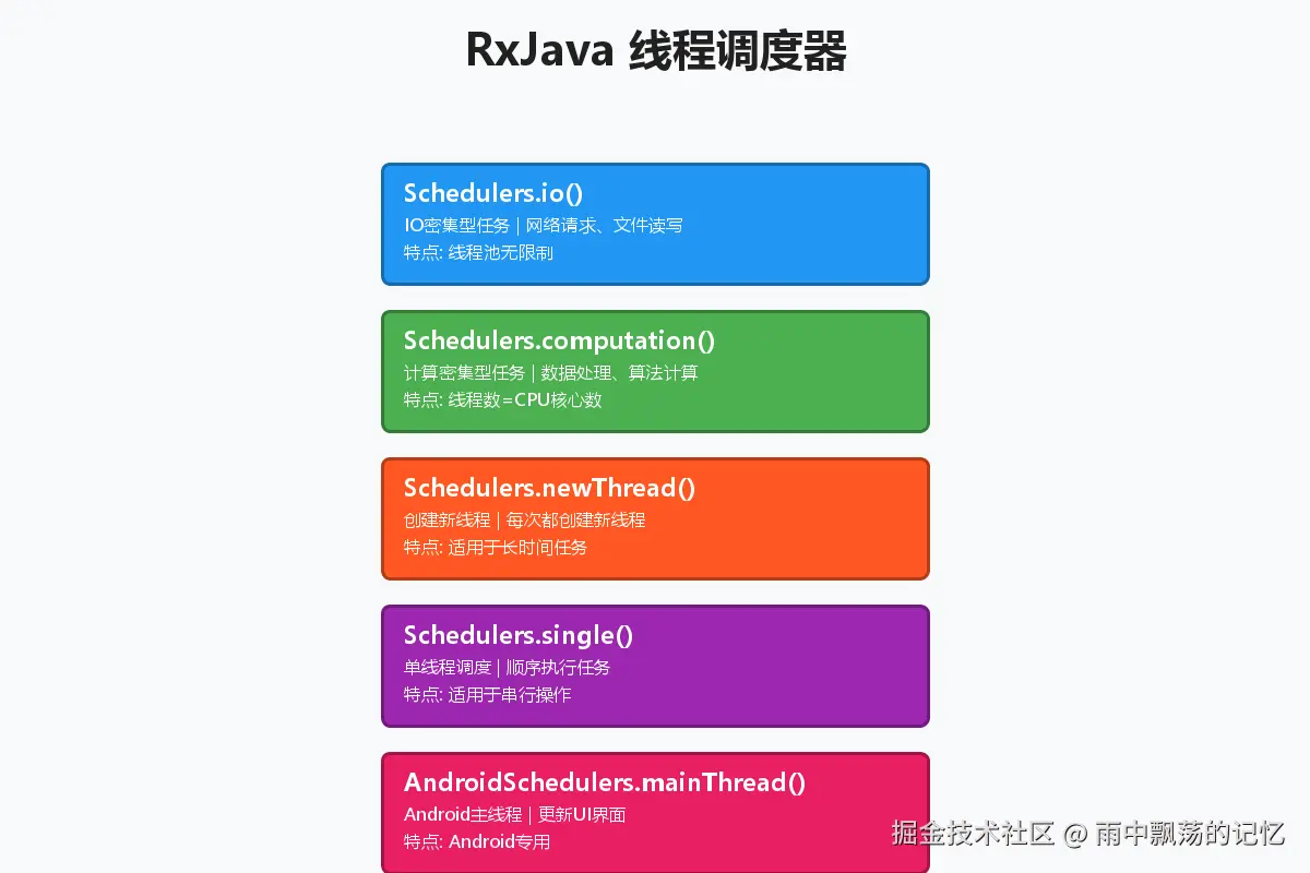 用于转换、过滤、组合数据流的中间操作。操作符是RxJava的精髓,提供了丰富的数据处理能力。