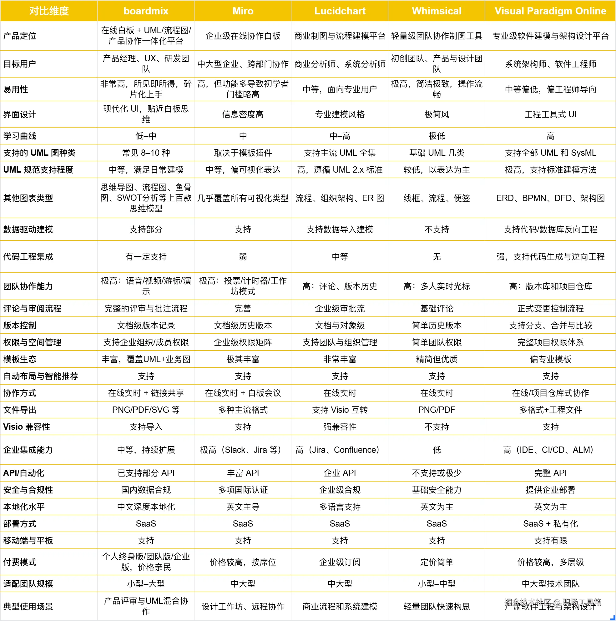 为了更直观地展示这五款工具的特点与差异,我们从易用性、协作性、UML专业度、集成能力和定价五个核心维度进行了对比,总结了每款工具的优势与定位,帮助你根据团队的特定需求做出选择——