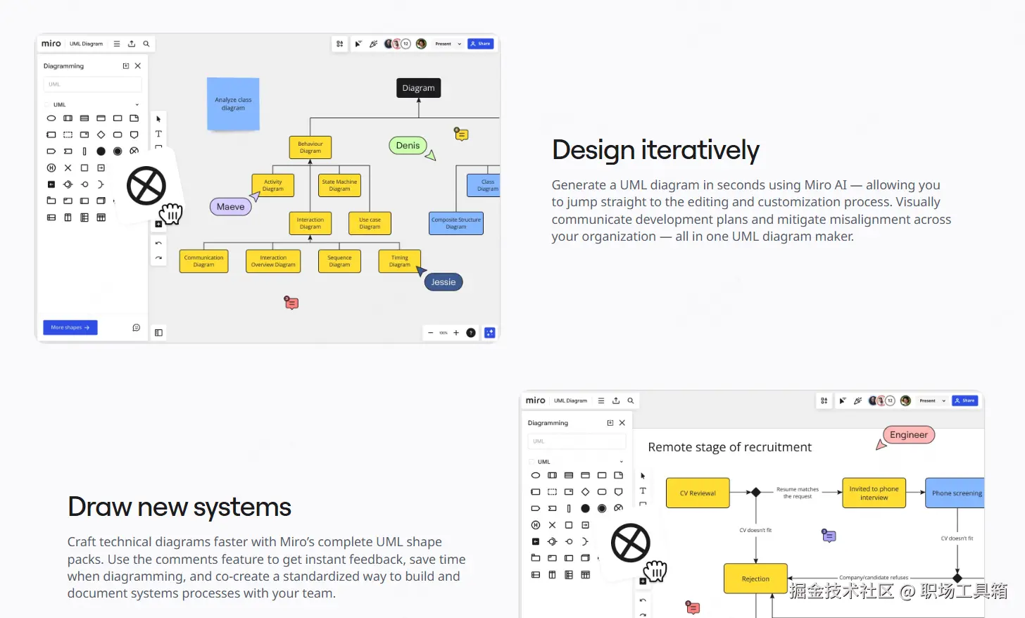 Miro已成为全球范围内广受欢迎的在线协作白板工具,被无数创新团队和大型企业用于远程协作、头脑风暴和工作坊。它提供了一个功能极其丰富的数字化画布,旨在将分布式团队凝聚在一起,共同创造和迭代想法。虽然Miro的核心定位是通用型协作白板,但其强大的可扩展性使其同样能够胜任专业的UML绘图任务。