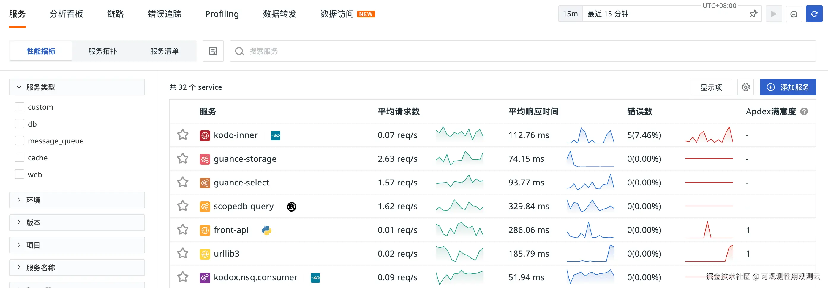 - 统计指标时序可视化:将服务列表中的平均请求数、响应时间、错误数等核心统计指标,从数值展示升级为时序图形式,直观呈现变化趋势。