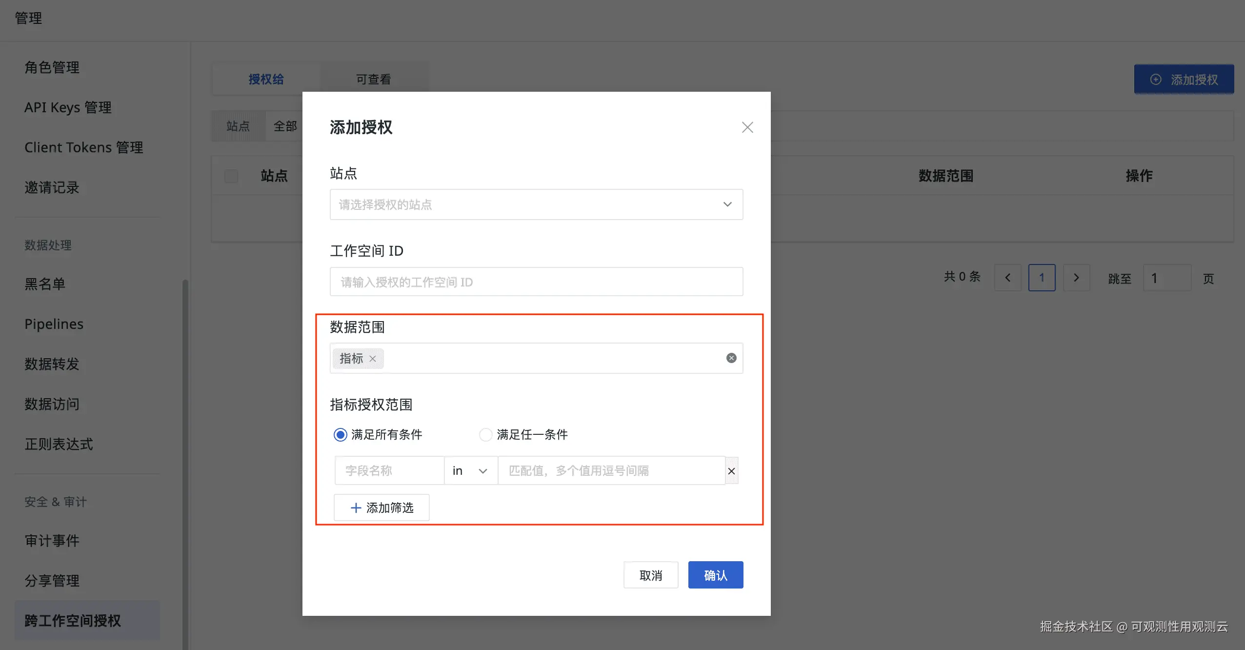 1、跨工作空间授权:当数据范围选择“指标”时,可对指标授权范围进行细化配置;