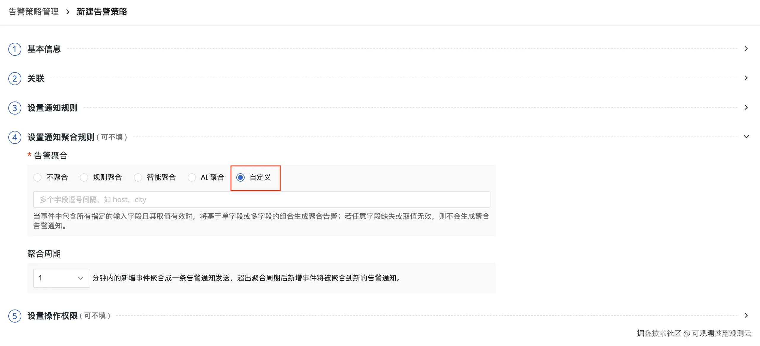 - 新增通知聚合规则:“自定义”。支持根据业务需求自由指定用于告警聚合的字段组合。输入字段名(多个字段以英文逗号分隔),系统将严格按此组合进行聚合:仅当事件数据包含所有指定字段且取值均有效时,才会触发聚合告警。