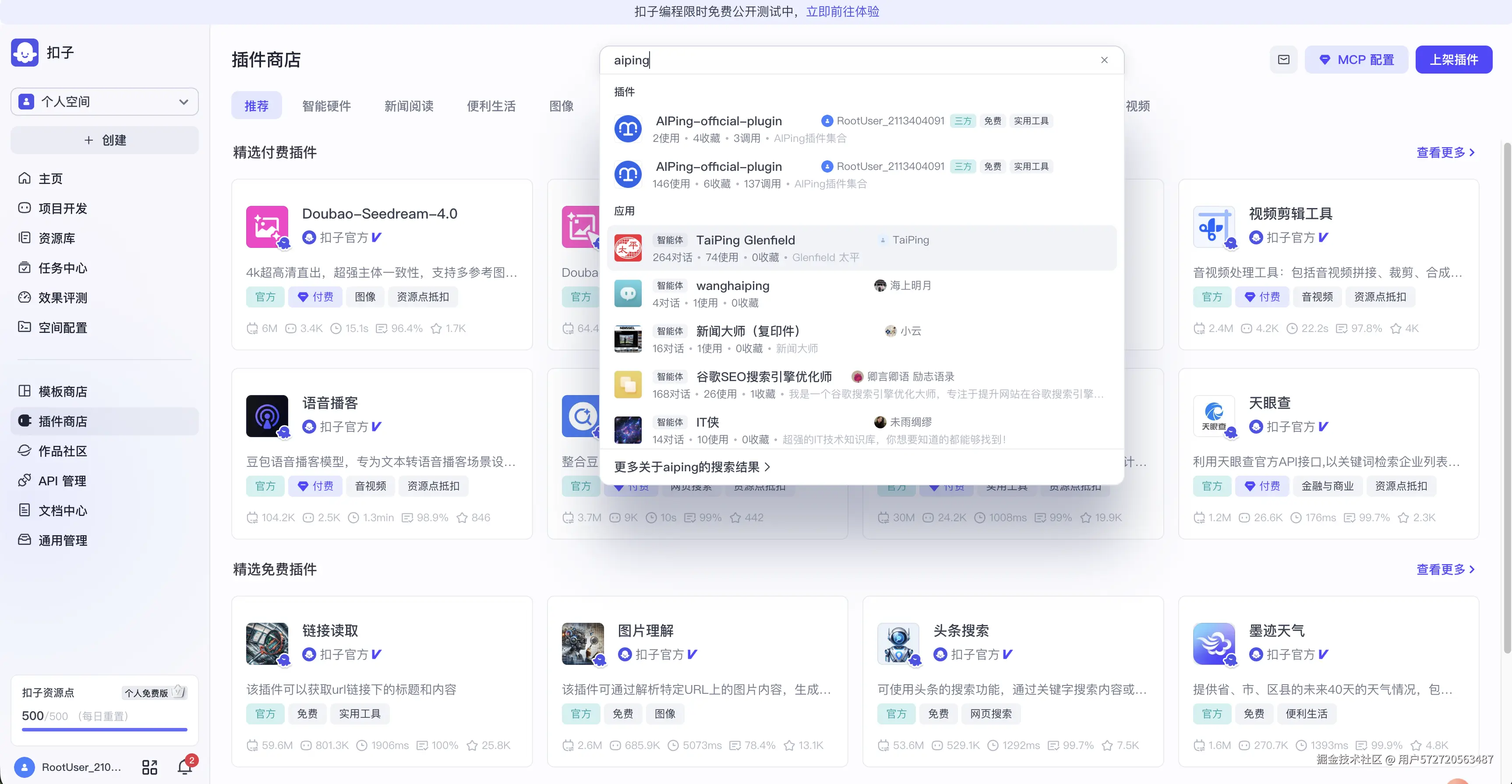 - 进入 coze 插件市场,搜索“AIPing-official-plugin”(点击插件详情页,可以进行“收藏”)