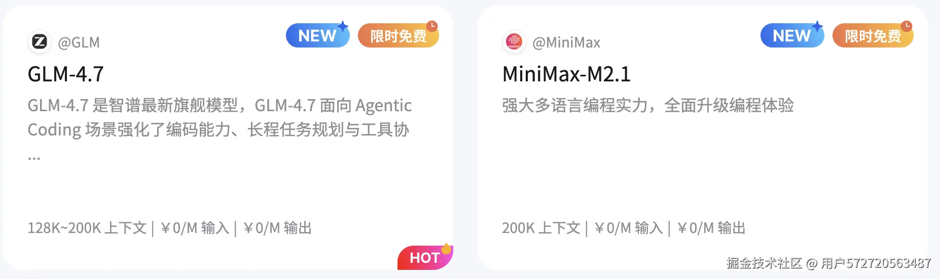 - 零元白嫖:GLM-4.7 与 MiniMax M2.1 目前开启限时免费,是进行压力测试和构建原型机的最佳时机。