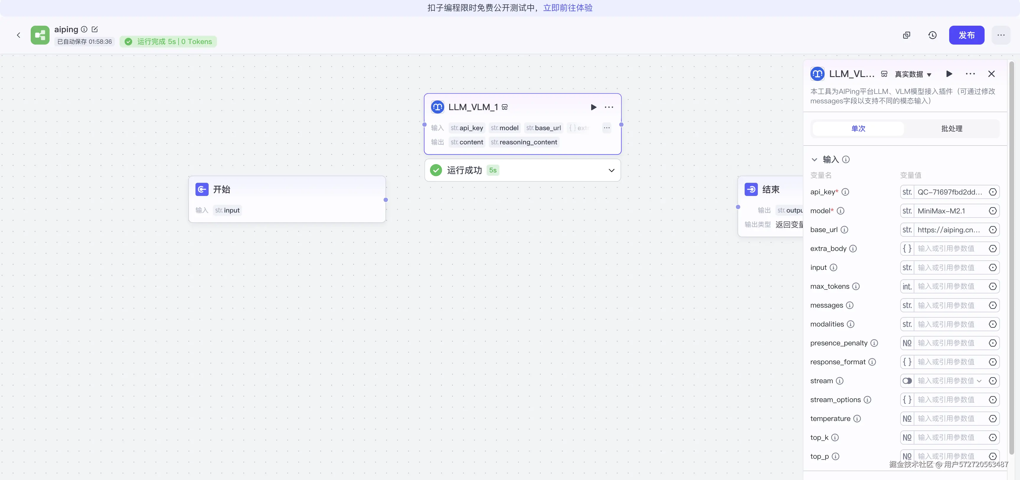 https://aiping.cn/api/v1) 和 API Key 能够直接填入 Coze 的 HTTP 插件或自定义 LLM 节点中。这说明 AIPing 完美兼容 OpenAI 标准协议。 - 模型调用: 你成功在 Coze 中驱动了 MiniMax-M2.1。从输出结果看,模型对 C++23