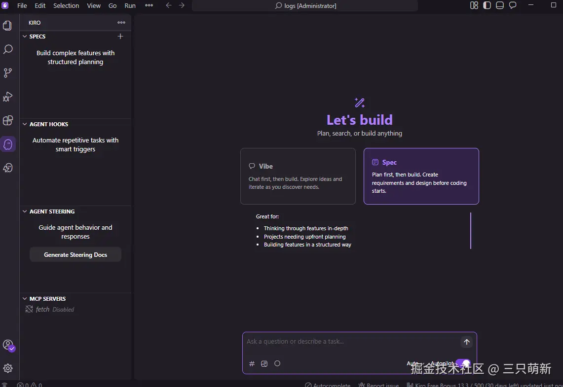 笔者始终关注各类工具在工程化场景中的实际表现。近期在社区偶然接触到 AWS 推出的 AI IDE Kiro,其核心卖点之一的 Spec 模式引发关注 —— 此前在 Trae 平台使用同类功能时,曾遭遇规范适配不足、流程冗余等问题,严格来说Trae 并未集成 spec 功能,可使用 Spec kit 来曲线救国,对两款工具的 Spec 模式进行系统性实测,旨在为团队选型提供客观参考。