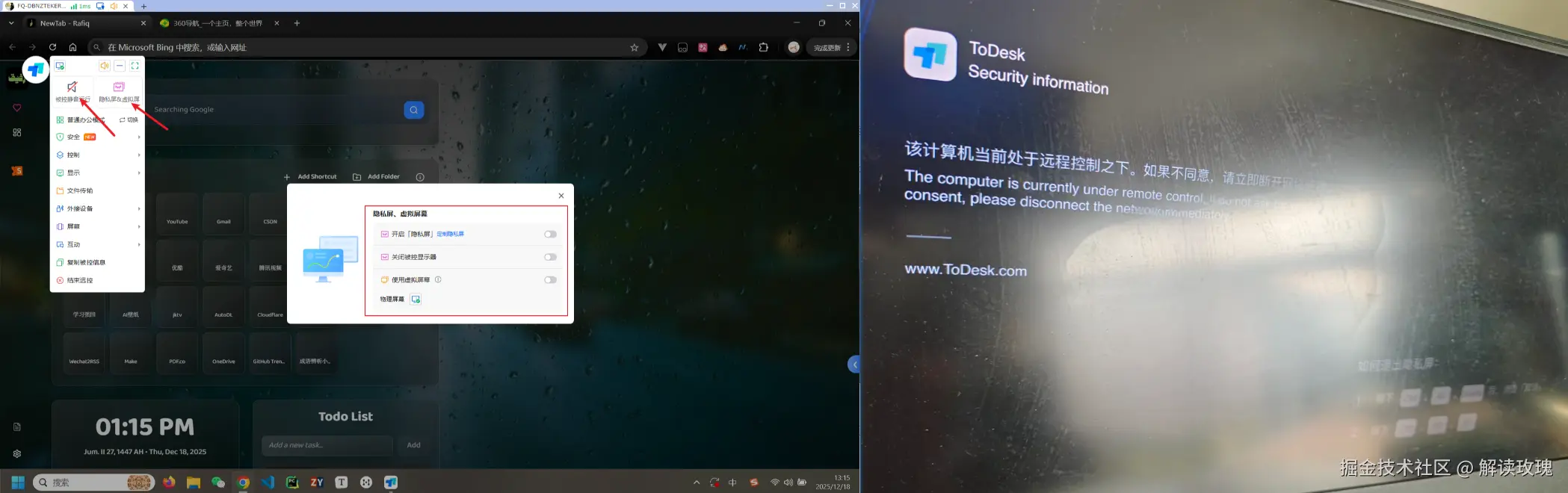 ToDesk最新功能增强了用户隐私保护,通过设置被控端静音运行和开启隐私屏,确保远程操作的安全性。隐私屏能够有效防止屏幕窥视,用户可在隐私屏设置窗口中选择定制屏幕、关闭显示器或使用虚拟屏幕,可以隐藏被控设备的屏幕内容。当隐私屏开启后,被控端显示远程中,使用户实时了解设备的远程控制状态。而被控静音运行顾名思义,可以在将被控声音传到主控,但被控设备处于静音状态,进一步提升远程控制中的隐私保护。