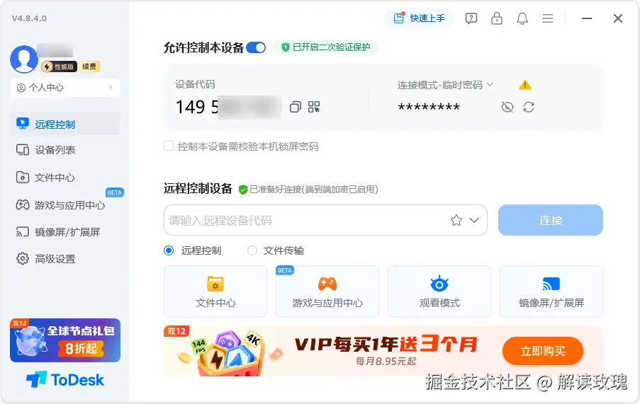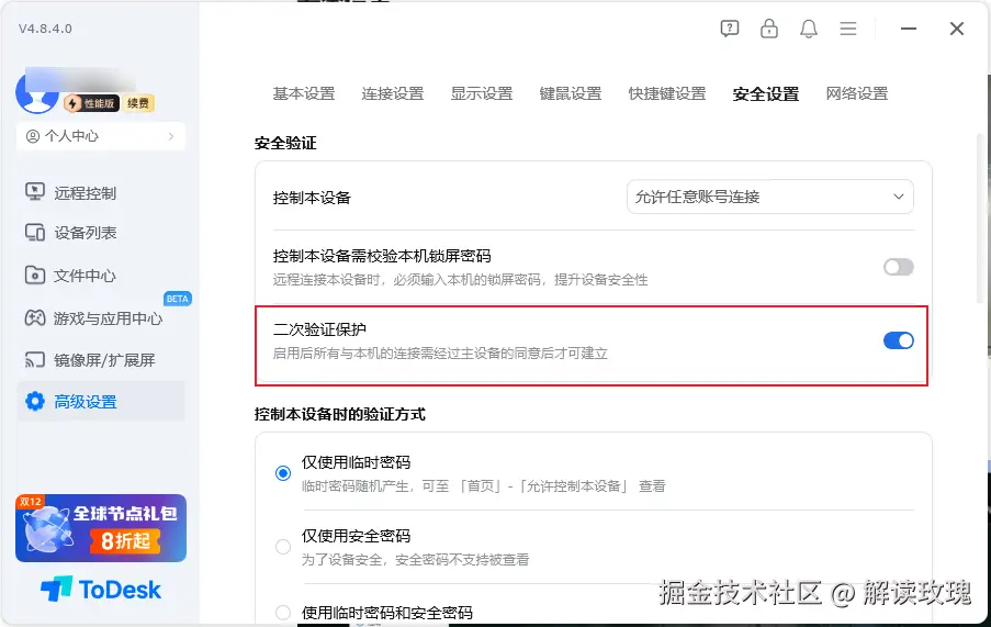 还可以二次验证,启用后所有与本机的连接都需要经过主设备同意后才可以建立,这样进一步的加强了远控的保护