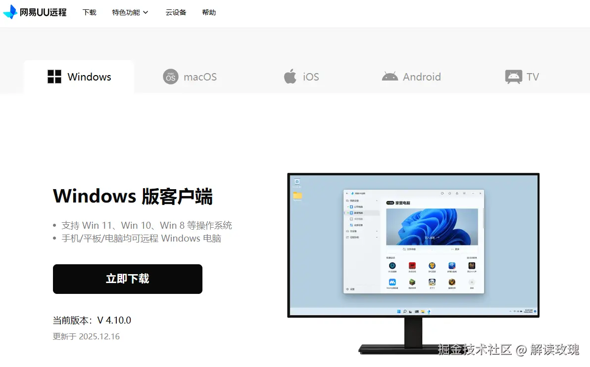 UU远程提供了多平台的下载选项,涵盖Windows、macOS、iOS、Android以及电视设备(Beta版),但有些端对端有限制,比如电脑控手机或手机互控都没有实现