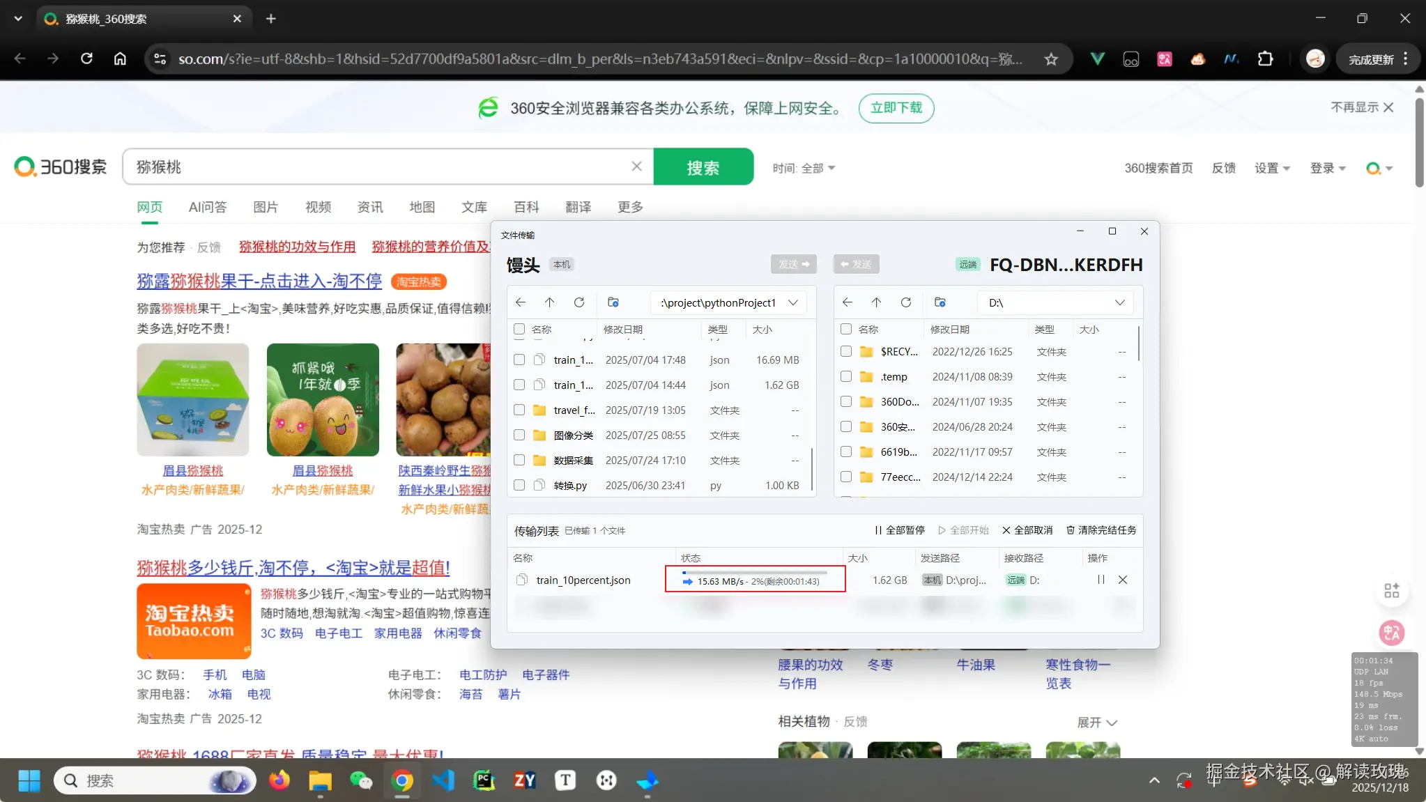 ToDesk的文件传输功能非常方便,支持两种传输方式。这里可以通过界面直接选择来进行传输,也可以在远程控制阶段进行文件传输。在这次操作中,选择了上传一个1.62GB的大文件,速度非常快,最高速度达到20.74MB/s。