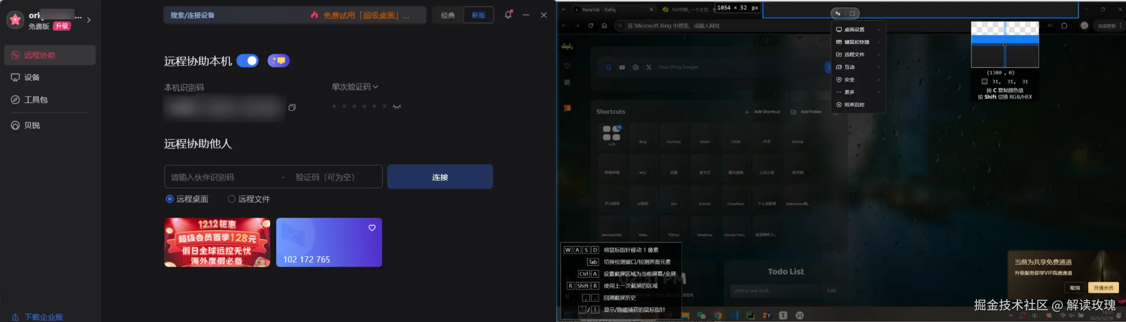 - 远控界面设计:ToDesk以其直观和现代的设计提供了最佳的用户体验,界面清爽且功能布局合理。AnyDesk和向日葵也表现不错,虽然AnyDesk的界面较为复古,但功能布局合理。UU和QQ作为游戏和社交的大厂附属功能,远控功能简化。TeamViewer虽然界面整洁,但在某些情况下可能出现小问题影响整体体验。