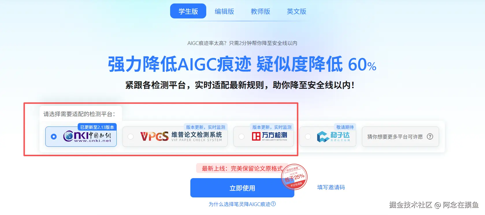 但是! 我们不可能从初稿开始就天天跑学校系统(太贵且有次数限制)。我们需要的是在提交给学校前,用免费有效的降ai工具先把那个吓人的AI率降下来。