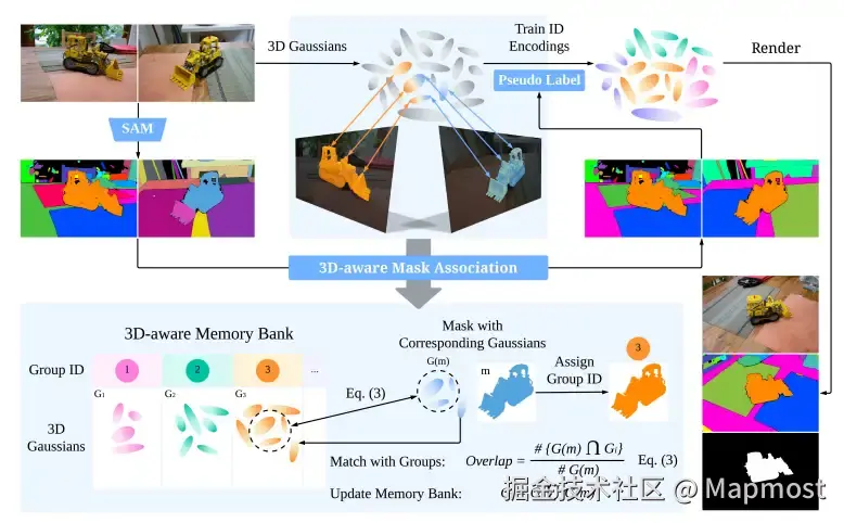 - **实现机制:**同一物理对象共享同一组3D高斯,识别共享高斯即可实现跨视角掩码关联。