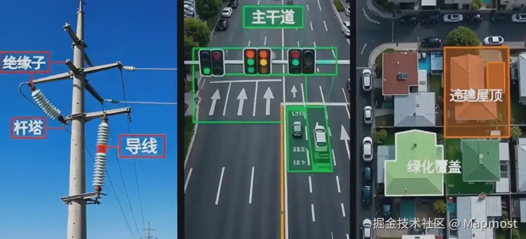无语义,不智能。在电力巡检中,系统需自动识别"绝缘子""杆塔""导线"并判断缺陷;在交通管理中,需区分"主干道""信号灯""路侧停车位"以支撑流量优化;在城市治理中,需定位"违建屋顶""绿化覆盖"用于监管执法。没有语义,这些闭环决策便无从谈起。