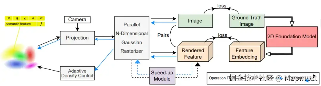 - 实现机制: 为每个高斯点附加128维可学习语义特征向量,通过渲染特征图并与2D基础模型(SAM、CLIP-LSeg)输出对齐,将预训练视觉模型的开放词汇能力迁移至三维空间。
