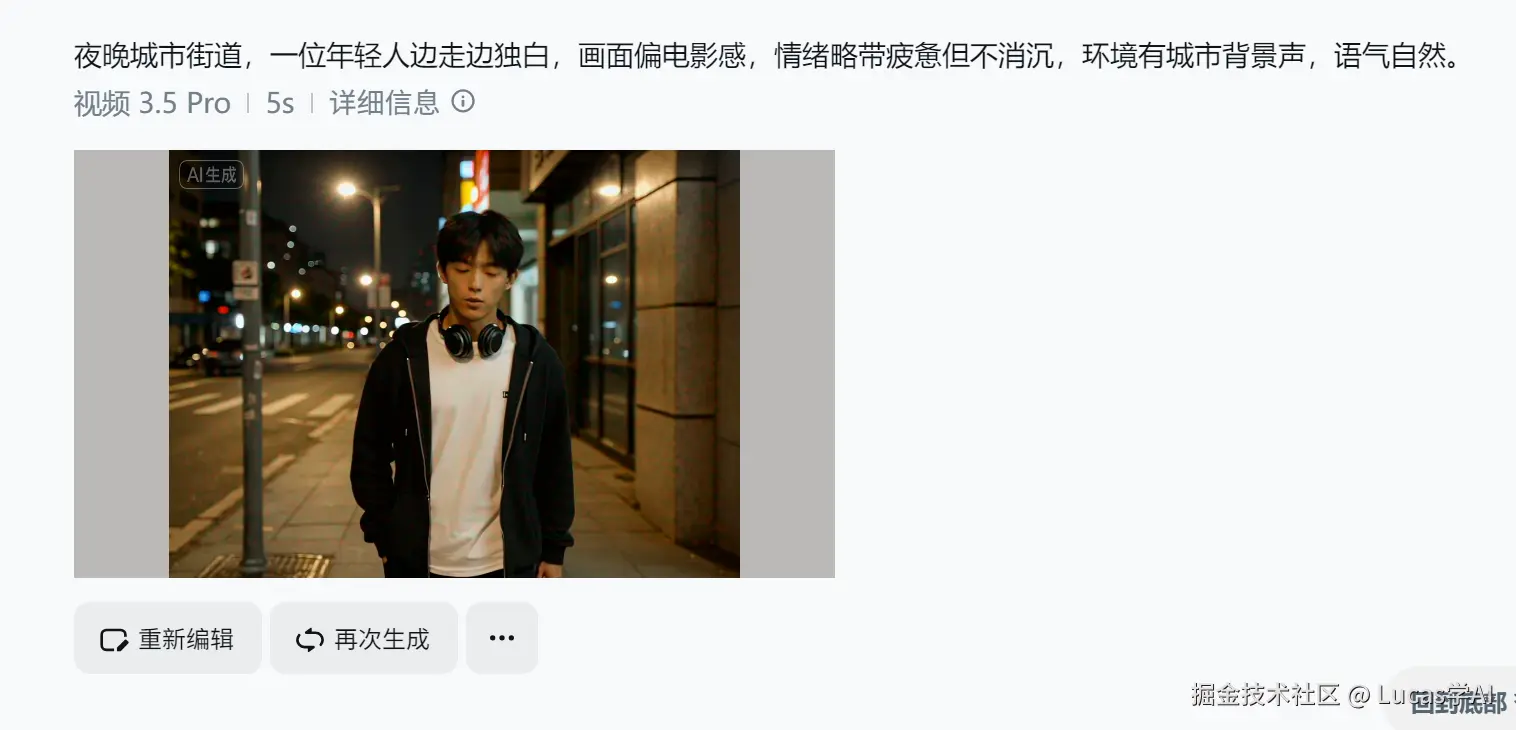 “夜晚城市街道,一位年轻人边走边独白,画面偏电影感,情绪略带疲惫但不消沉,环境有城市背景声,语气自然。”