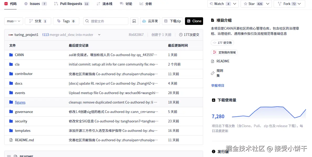描述: “CANN 开源社区的核心管理仓库,包含治理章程、组织架构、操作指引等。”