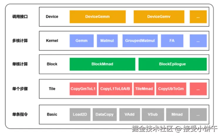 Catlass 将复杂的算子开发任务解耦为四个层级,自顶向下屏蔽硬件细节:
