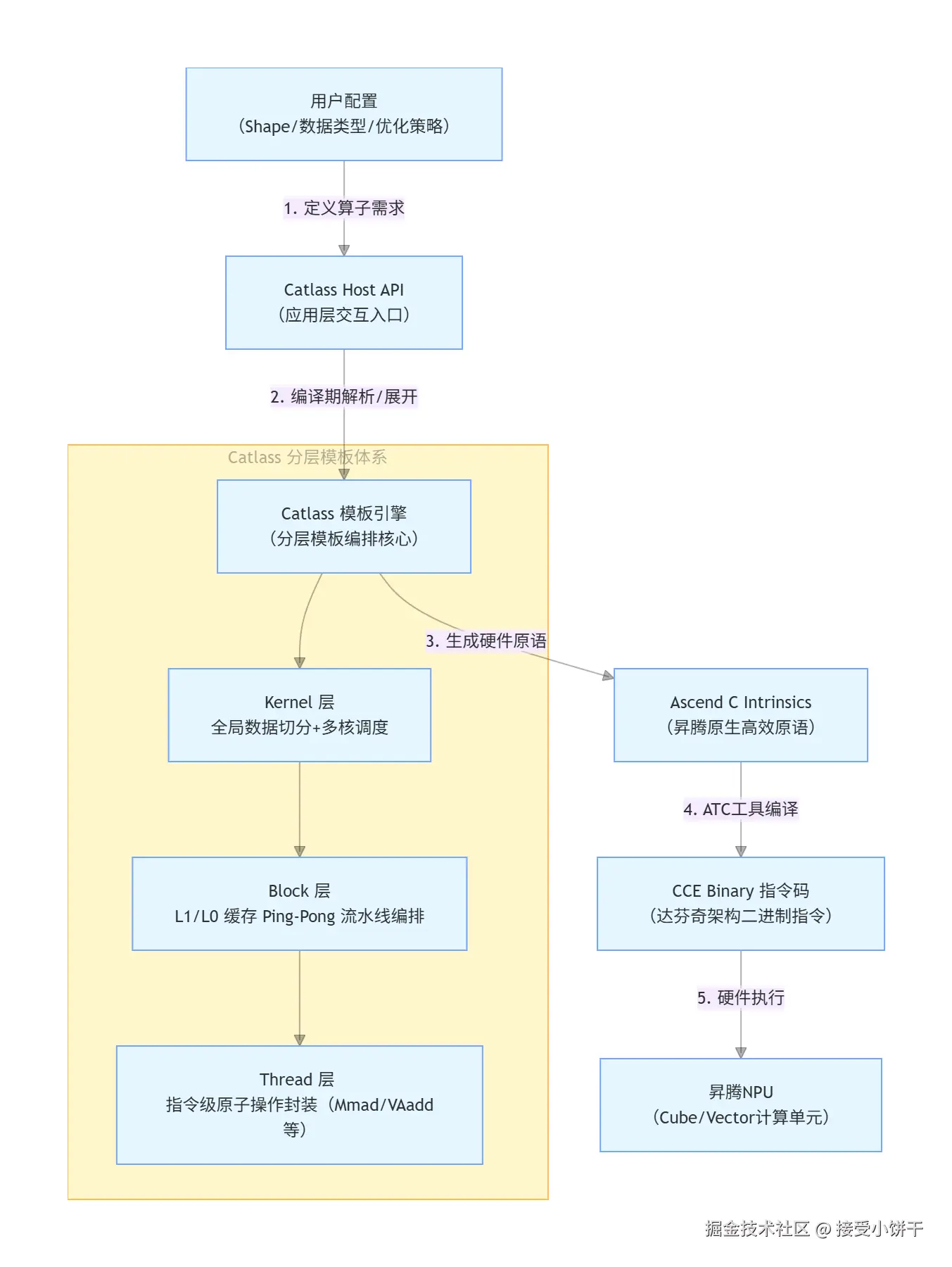 Catlass 作为昇腾 NPU 场景下 “编译期算子生成器”,承接应用层配置与底层硬件执行,实现算子从用户配置到硬件指令的自动化生成与优化,核心流转逻辑如下:
