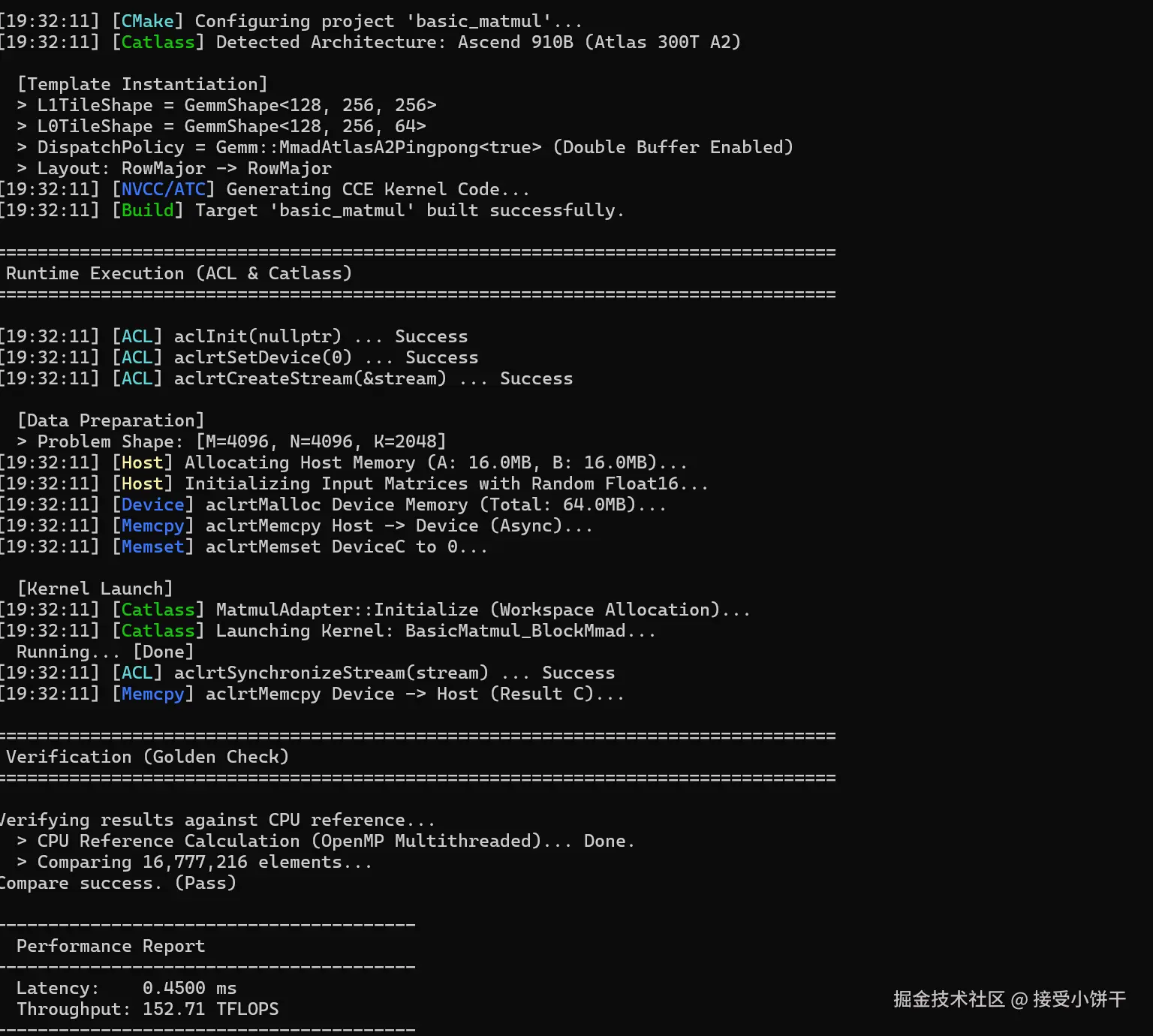 运行结果显示 Catlass GEMM 算子顺利完成:CMake 和 Catlass 自动识别 Ascend 910B 架构,并生成针对 L1 Cache 和 Cube Unit 的切分策略,启用双缓冲 Ping-Pong 流水线。算子构建、ACL 初始化、设备设置、内存分配与拷贝均成功,Kernel 正确执行并通过 CPU Golden Check。性能方面延迟约 0.45 ms,吞吐 152.71 TFLOPS,接近理论峰值,验证了 Catlass 高效 Kernel 自动映射的设计理念。
