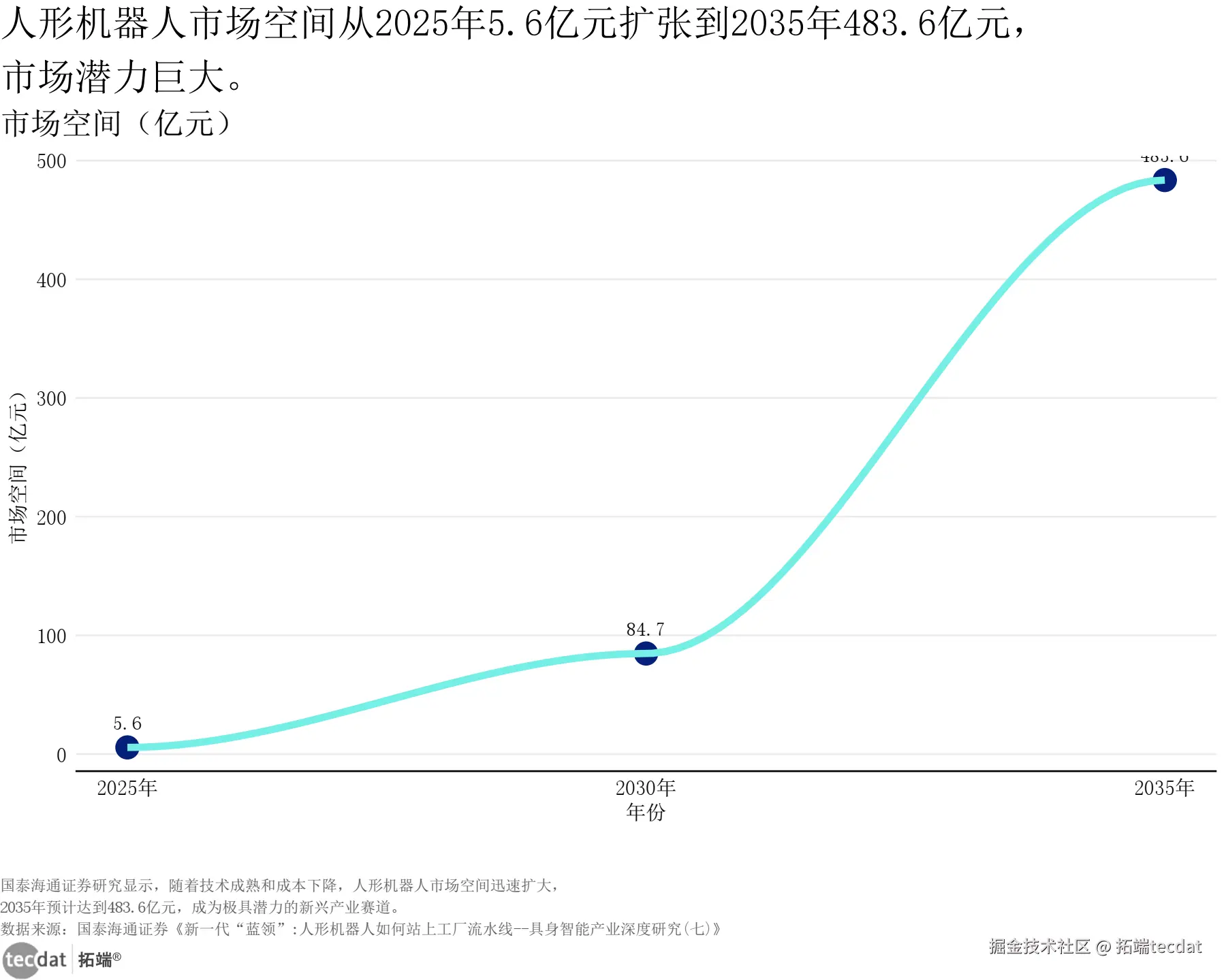 | 人形机器人市场规模 | 国泰海通证券:2035年中国工业场景市场空间483.6亿元 | 预测年份与场景范围不同 | 国泰海通聚焦工业场景,聚焦确定性较高的落地领域 |