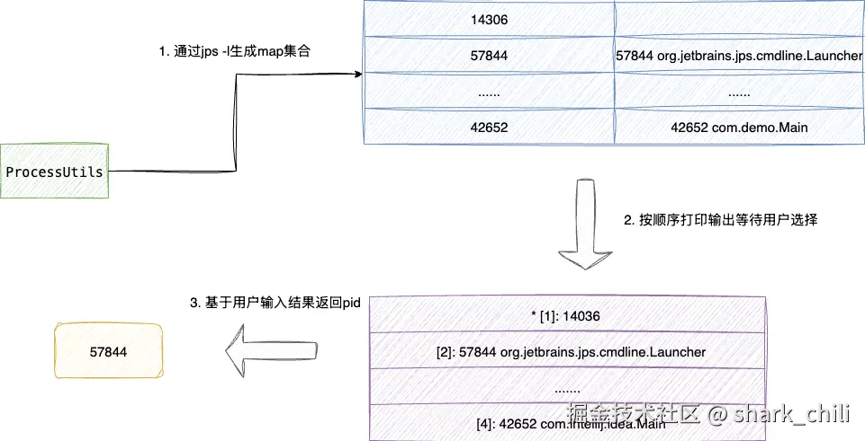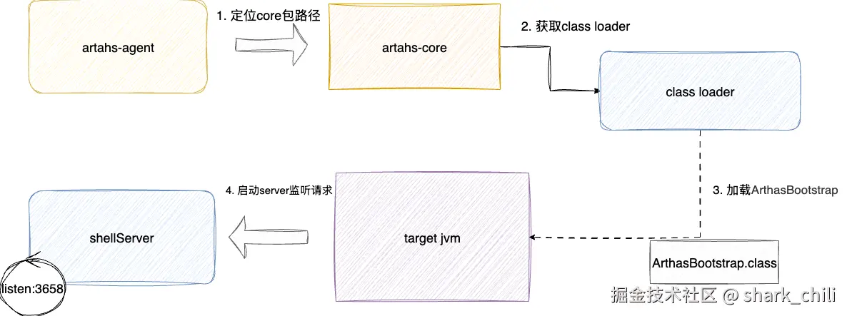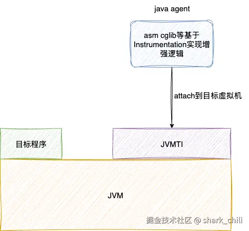对应其工作流程如下图,通过VirtualMachine遍历定位到目标进程后,将agent attach到目标进程,执行agentmain完成jvm实例增强: