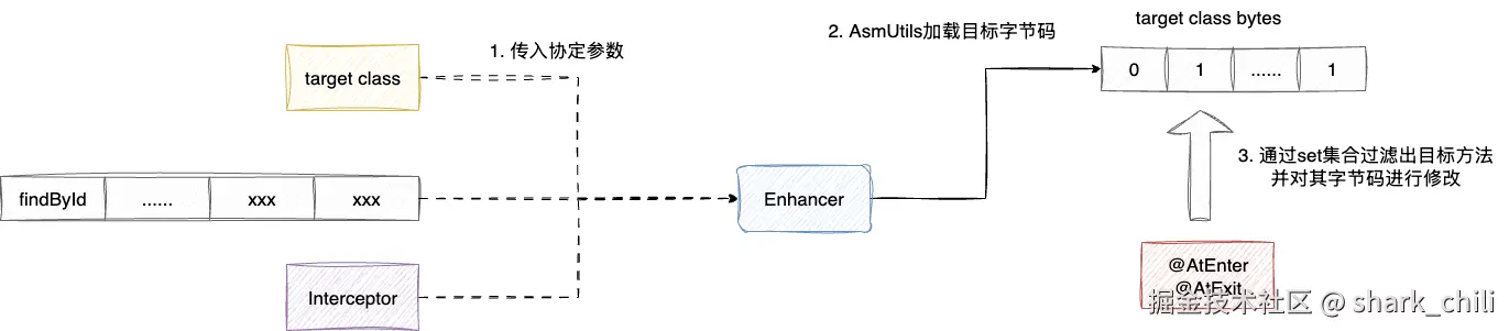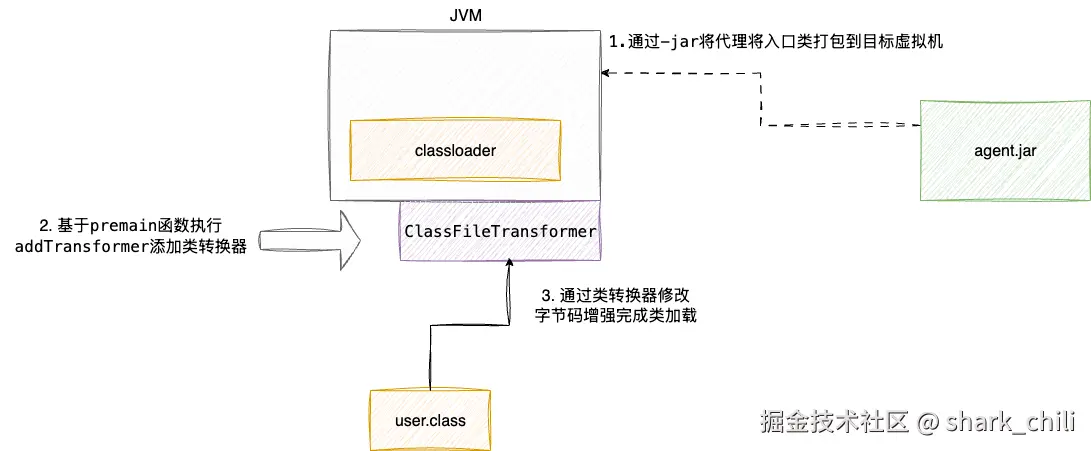 对应我们也给出运行流程图,如下图,我们通过-jar 参数将打包好的jar包attach到目标虚拟机,在启动前通过addTransformer将字节码转换器添加到目标JVM拦截所有类实现定制化字节码增强。