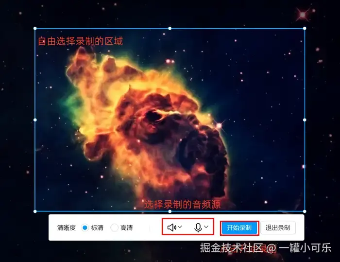 第二步,成功进入 【屏幕录制】 界面后,用户可自由选定录屏区域,同时配置音频输入相关设置,所有参数调节到位后,点击 【开始录制】 按钮便会进入录制状态;