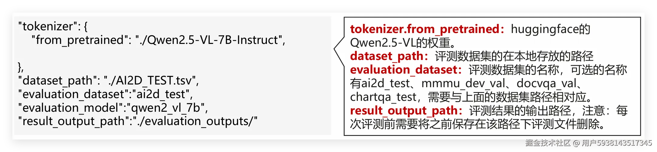 然后修改examples/qwen2.5vl/evaluate_qwen2_5_vl_7b.json,重点配置这几个参数,别写错路径: