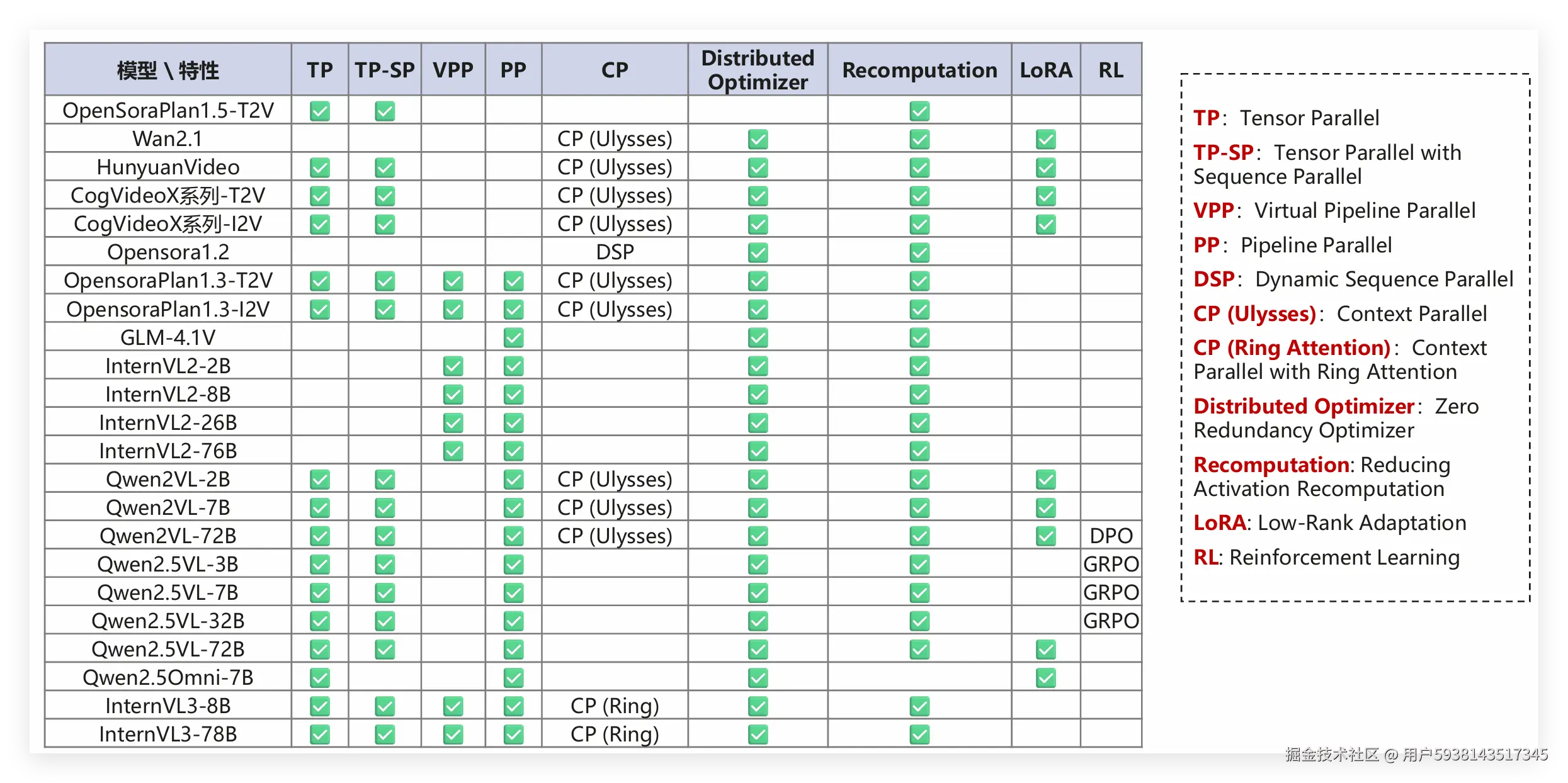 这里解释下几个关键术语,避免新手踩坑:TP(Tensor Parallel)是张量并行,CP(Context Parallel)是上下文并行,DSP(Dynamic Sequence Parallel)是动态序列并行,LoRA(Low-Rank Adaptation)是低秩适配,适合小数据集微调,RL(Reinforcement Learning)是强化学习,多用于模型效果迭代。