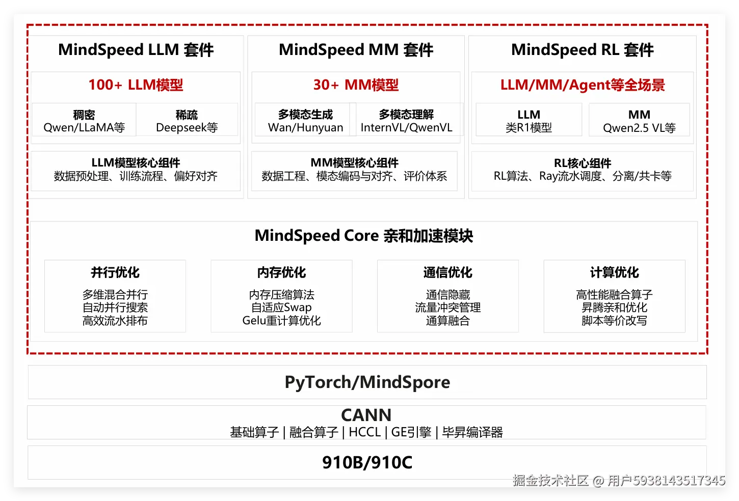 - 底层基础层:基于昇腾芯片,整合 CANN、HCCL、毕昇编译器,支持 PyTorch/MindSpore,实现模型与硬件高效适配,无需手动调参。