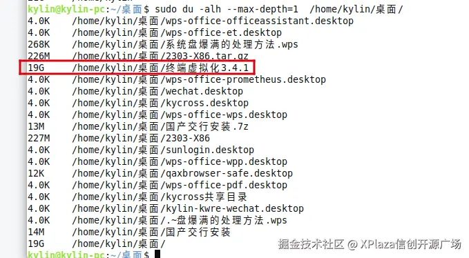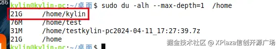 再输入命令:sudo du -alh --max-depth=1 /home/kylin,更换需要查看的目录,然后一级一级的往下查找。