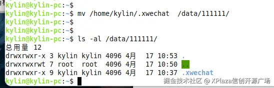 再输入命令:ln -s /data/111111/.xwechat /home/kylin/.xwechat,创建软链接,将迁移后的目录链接到原来的目录下,详细如下图所示。