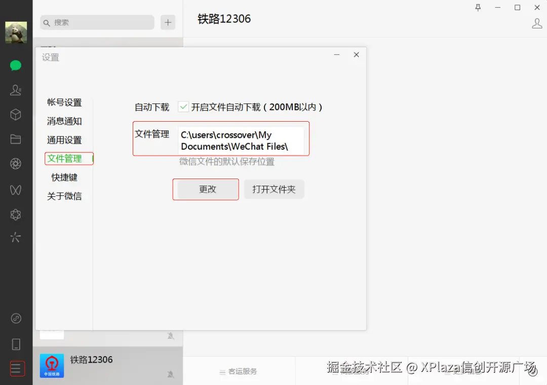 以Win32版微信为例,可以通过在“右下角三条横杠图标->设置->文件管理”处,将文件管理的路径更改到大容量磁盘的目录下。