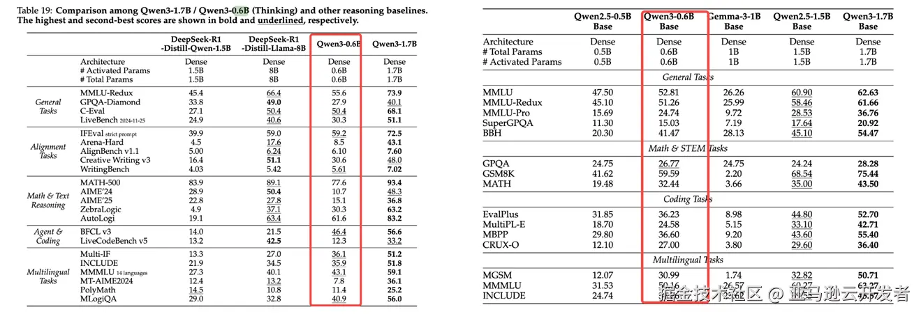 根据图1官方评估结果,Qwen3 0.6B 在多个评测基准上的表现甚至超过了参数量更大的模型。在 MMLU 任务中,Qwen3 0.6B 获得了 52.81 的分数,在 Math & STEM 类任务的 GPQA 测试中得分 26.77,在 Coding 类任务的 EvalPlus 中达到 36.23 分。这些数据充分体现了模型在通用语言理解、数学推理和代码生成等多个维度的综合能力。对比 Gemma-3-1B(1B 参数)和 Qwen2.5-1.5B(1.5B 参数)等更大规模的模型,Qwen3 0.6B 在某些特定任务上展现出相当甚至更优的性能,证明了其训练和优化策略的有效性。