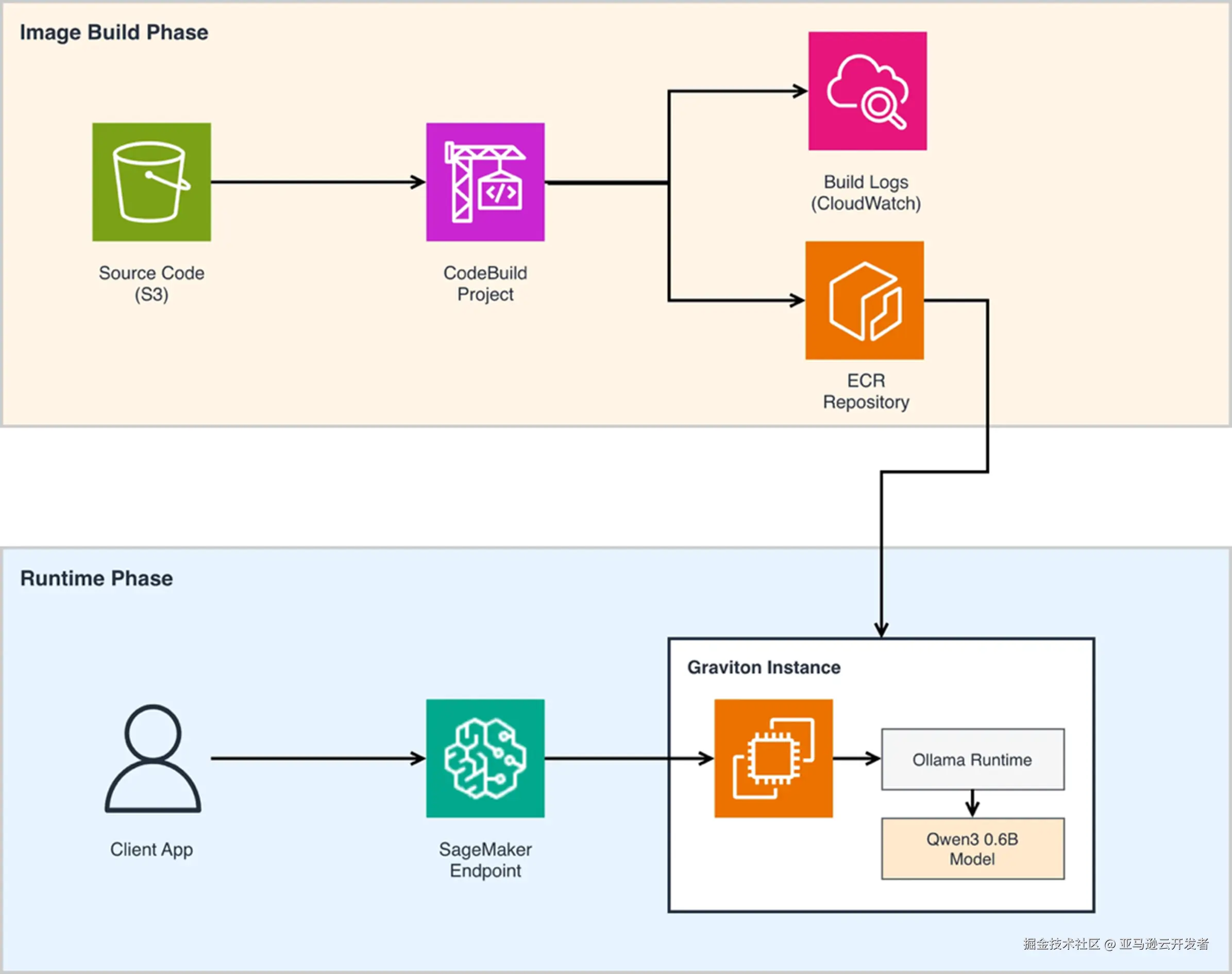 在运行时阶段(Runtime Phase) ,客户端应用通过 Amazon SageMaker Endpoint 发起推理请求。SageMaker Endpoint 将请求路由到运行在 Graviton 实例上的容器。在 Graviton 实例内部,Ollama Runtime 负责模型的加载和推理执行,Qwen3 0.6B 模型以优化的方式运行在 ARM 架构上。这种架构使得推理服务可以充分利用 SageMaker 的自动扩缩容、流量分配和模型版本管理等能力。
