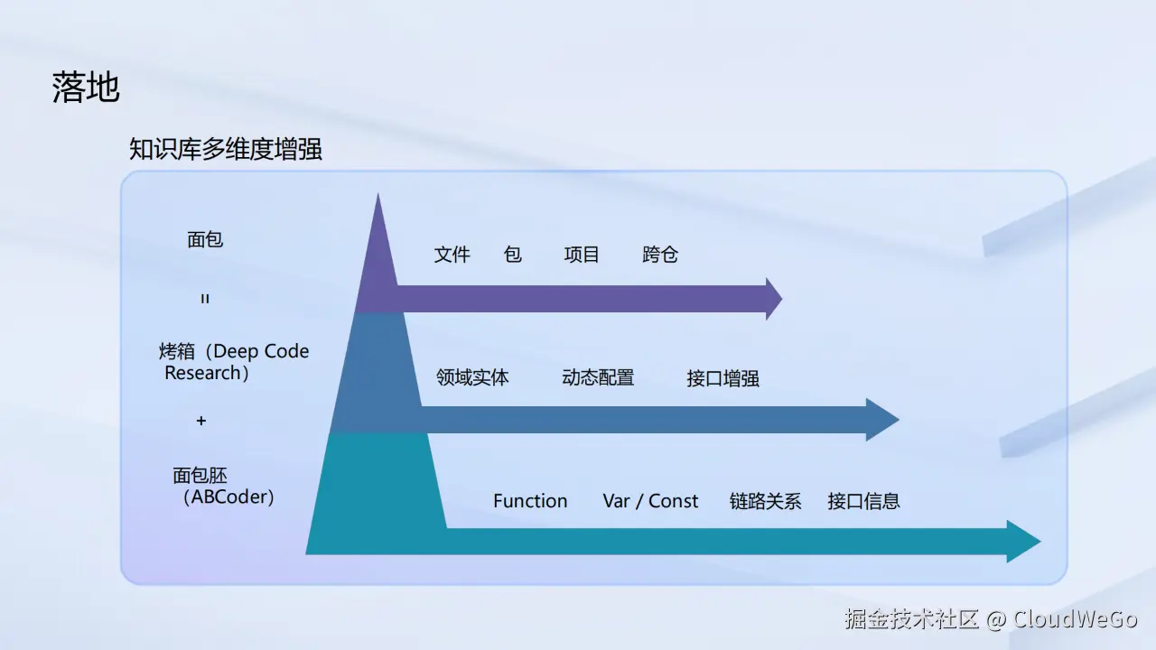 团队将 ABCoder 与 Deep Code Research 的能力应用于构建多维度增强知识库。 如果说从代码中提取的基础信息,如变量、函数、接口及其调用关系等是制作面包的"面粉",那么通过 Deep Code Research 的深度加工,团队便能得到蕴含更高价值的"面包"------即高阶领域知识。