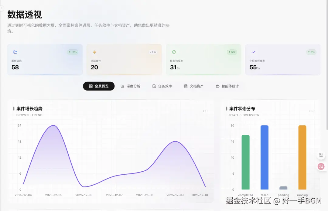 实时指标: 案件总量、活跃案件数、任务完成率、平均胜诉率等。