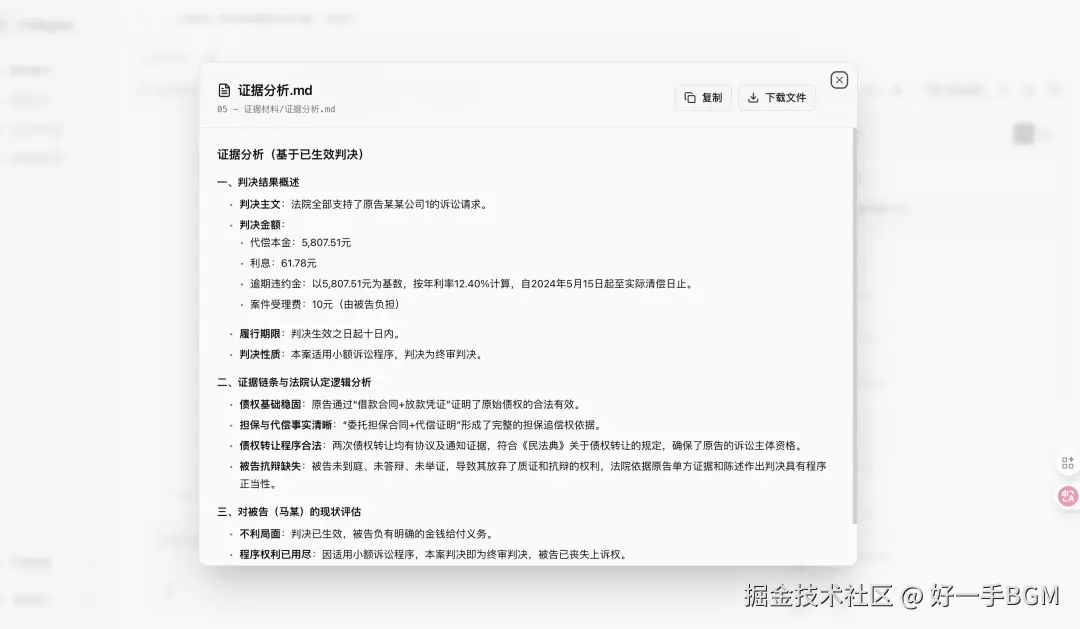 深度分析,评估风险: 证据分析 Agent 自动识别关键证据及其证明力;争议识别 Agent 梳理出本案的争议焦点、法院的认定逻辑,以及可能存在的争辩空间。