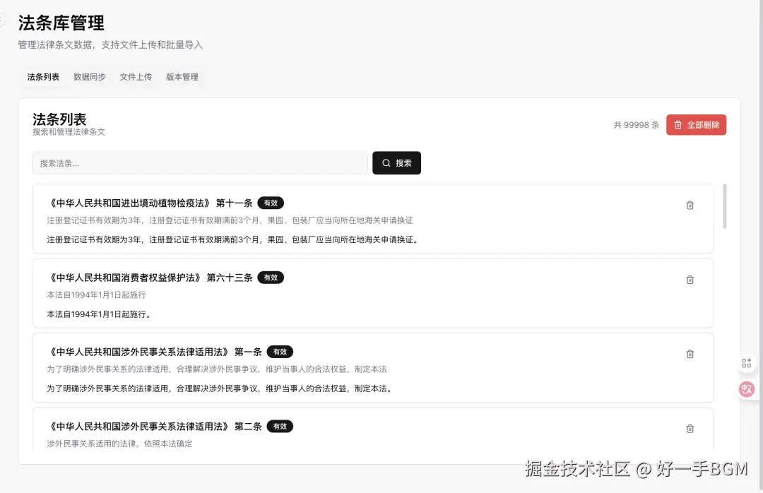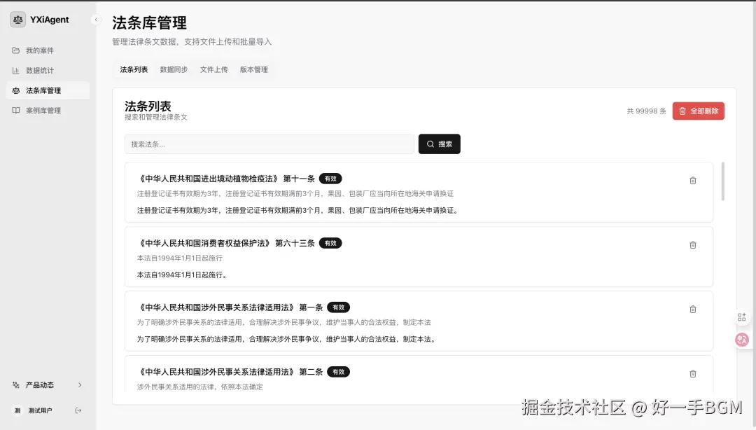 法条检索: 按关键词、法域、效力层级检索,并在案件分析中自动关联相关条款。