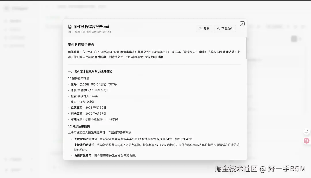 一键汇报,沉淀资产: 客户报告 Agent 生成《案件分析综合报告》,将复杂的法律分析结果用客户能听懂的语言重新组织。该案件的所有要素、分析结果与文书输出被记录在系统知识库中,成为机构可复用的知识资产。