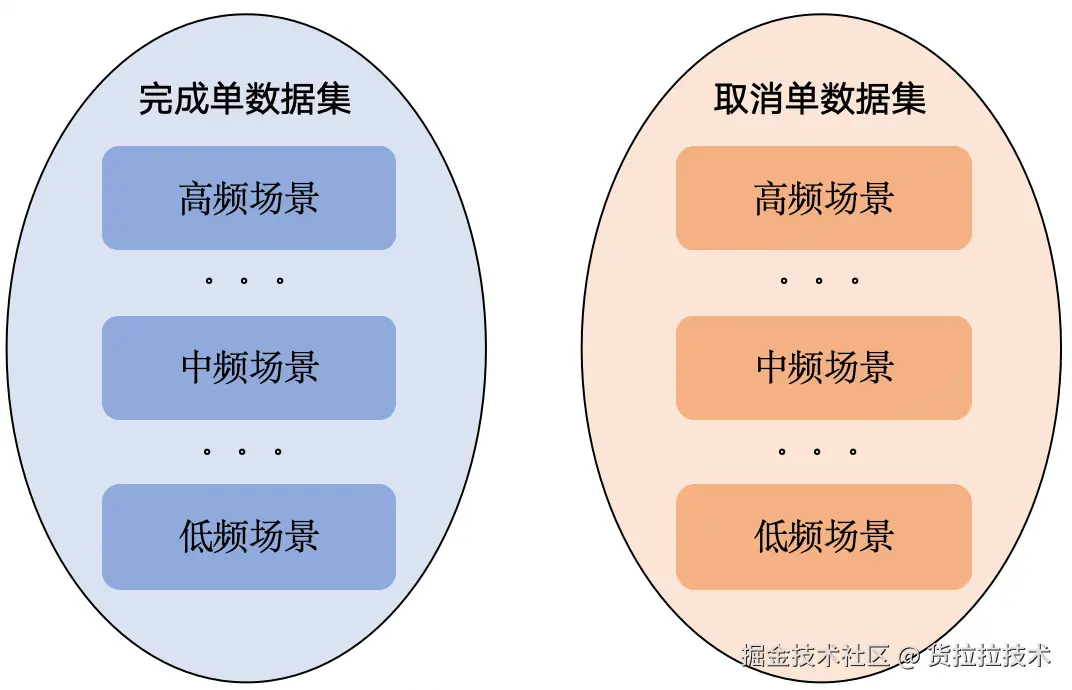 基于用户行为分析和货物分布特征,我们构建了分层抽样数据集:按用户行为将完成订单和取消订单数据分离,对完成订单以用户实际选择车型作为参考标准,对取消订单则综合完成订单数据进行重新标注。在对取消单场景调优时可以对比完成单场景来监督其是否有退化现象。同时按货物分布优先覆盖高频货物场景,确保数据集的代表性和实用性。如图所示: