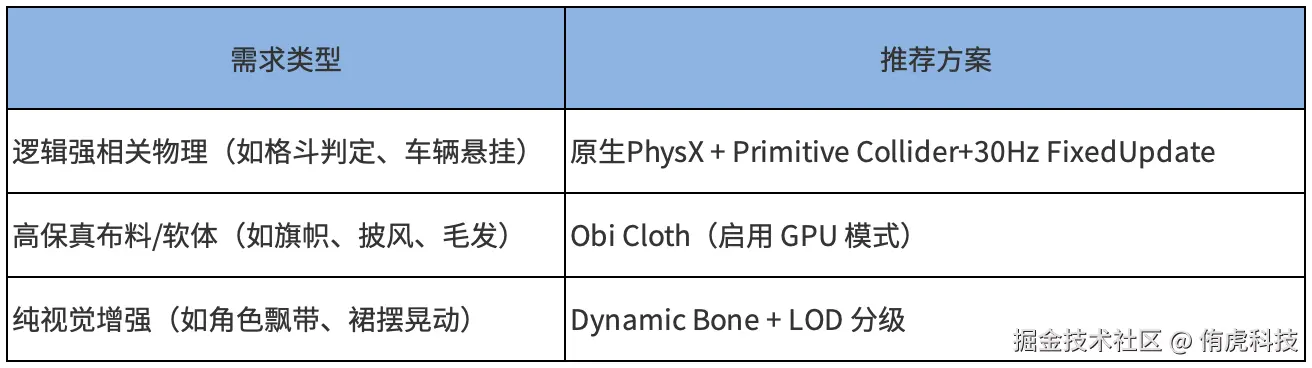 适用场景: 角色布娃娃、关卡交互物体、简单布料、碰撞反馈。关键优化实践: