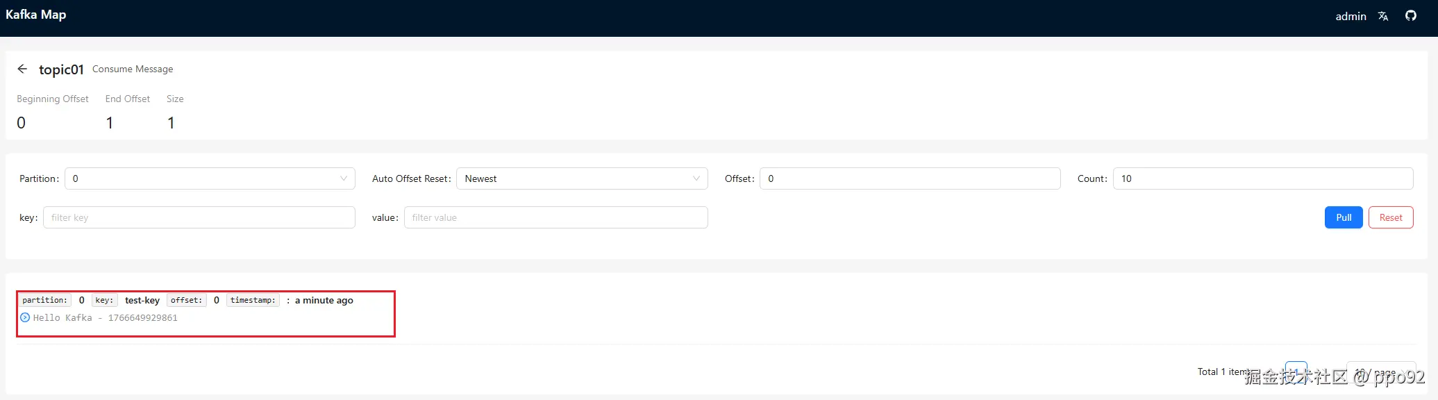 3、查看结果,可以看到发送成功,kafka也成功接收到了发送的消息